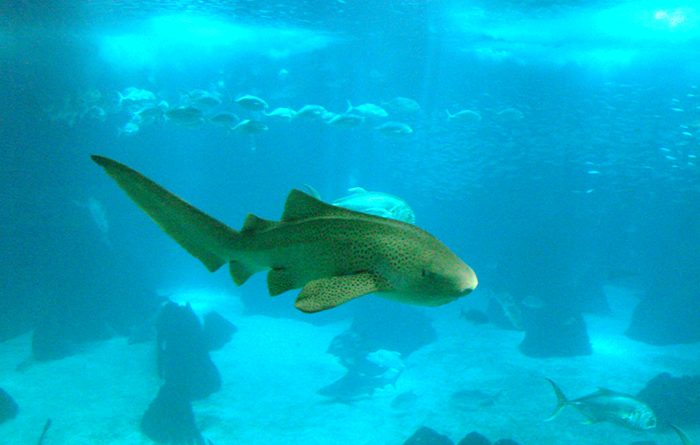 Uma espécie de tubarão inofensivo tem o costume de ficar no fundo do oceano com a boca virada contra a corrente para poder respirar com tranqüilidade e sem esforço. O tubarão zebra quando jovem tem tonalidade do corpo preta com bandas verticais claras parecidas com as da zebra já os adultos tem um tom claro e manchas escuras.O tubarão zebra é um peixe pequeno e também já foi encontrado em águas doce ele é um predador nato pode alem dos peixes que é um dos seus alimentos ele também come ate tubarões maiores.
