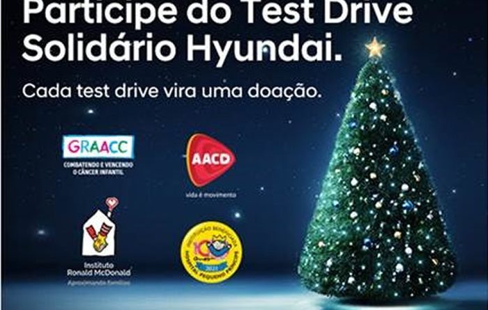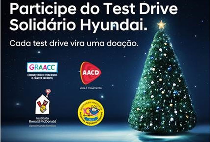 A Hyundai Motor Brasil e sua Rede de Concessionárias realizam, até o dia 20 de dezembro, a campanha “Test Drive Solidário”. Para cada teste realizado em qualquer modelo das linhas HB20 ou Creta, nas mais de 220 lojas distribuídas por todo o País, a montadora sul-coreana vai doar R$ 60 para as entidades participantes.