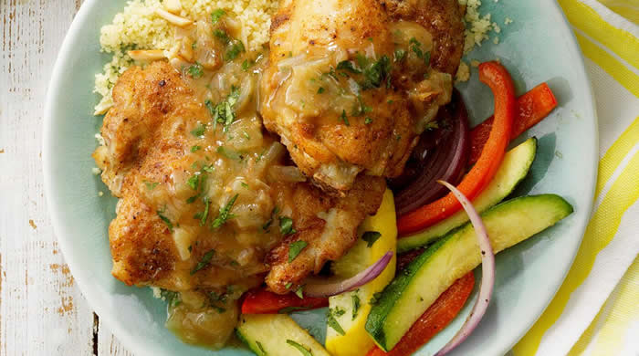 Cortar o frango em pedaços e refogar no azeite com o alho e a cebola picados. Juntar a água, o sal, a pimenta, o coentro, a canela, o açafrão e o tomate picado. Ferver até ficar macio. Desfiar e reservar. Coar o caldo e levar ao fogo. Quando levantar fervura, juntar o arroz e a abobrinha picada. Retificar o sal, se necessário. Colocar noz moscada e um pouco mais de água se for preciso. Cozinhar em fogo baixo durante 15 minutos. Quando o arroz estiver pronto, misturar as amêndoas. Arrumar numa travessa rodeado pela carne de frango.