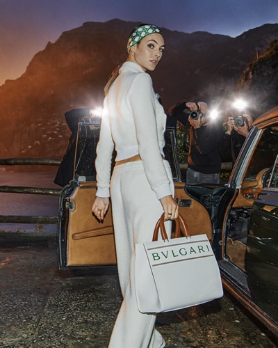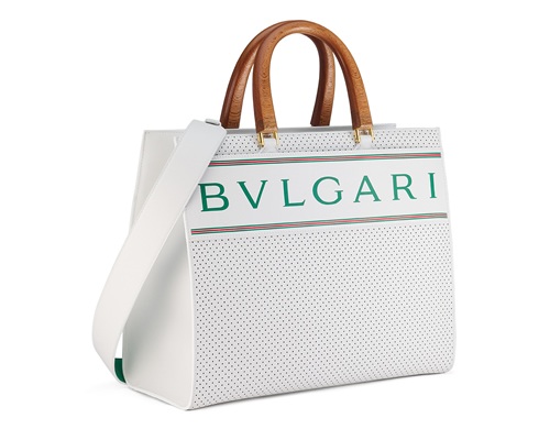 O equilíbrio perfeito de conforto e elegância é a espaçosa Tote Bag, onde o corpo branco do tênis é animado com uma decoração arrojada do logotipo BULGARI na frente e elegantes alças de madeira. Prática e chique, lúdica e icônica, moderna e atemporal, ela expressa perfeitamente a intrigante dualidade de toda a coleção.