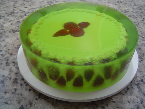 Montagem do bolo: Untar uma assadeira de fundo falso com óleo. Colocar o bolo já recheado sobre um disco de papelão e decorar com o glacê. Levar o bolo para a forma, colocar no freezer para gelar bem. Depois de bem gelado, colocar um pouco da gelatina líquida para vedar a forma, como o fundo (da forma) está bem gelado automaticamente a gelatina vai criando uma película. Depois de vedada colocar até 5 cm da gelatina e levar novamente a geladeira até endurecer. Tirar da geladeira, acrescentar o restante da gelatina e deixar gelar até endurecer.